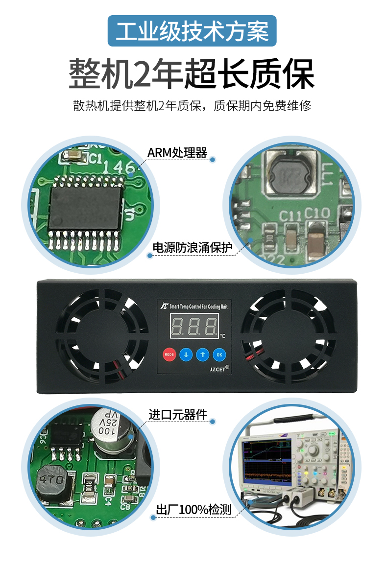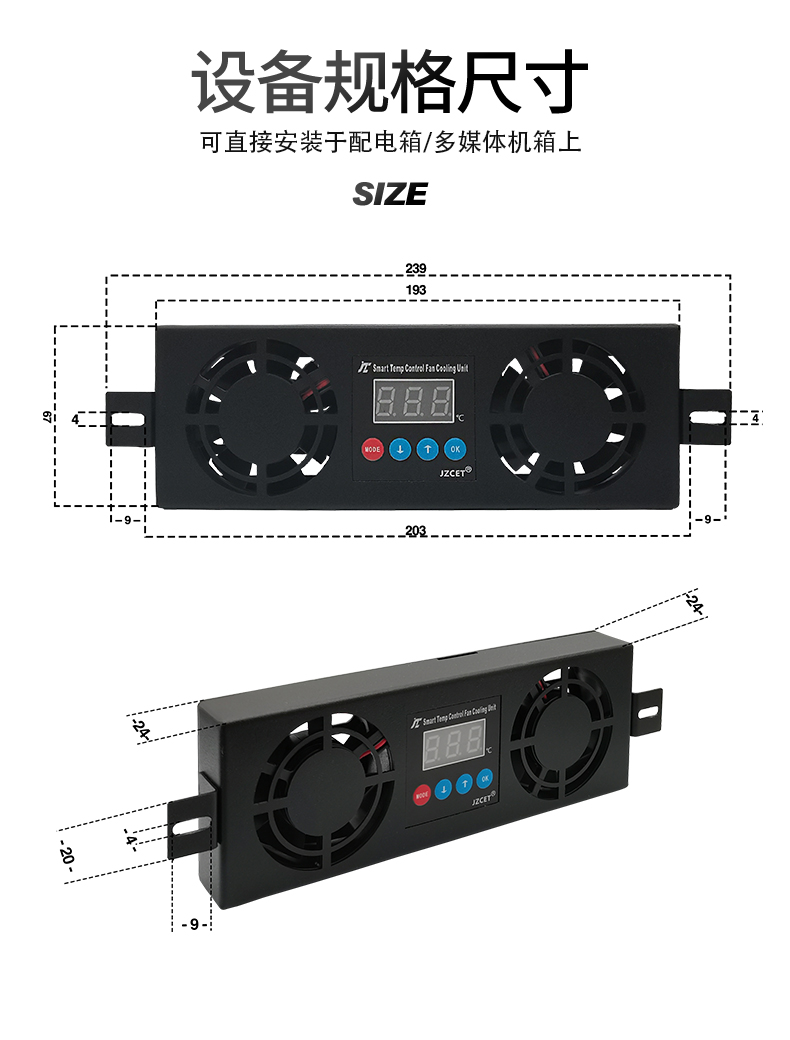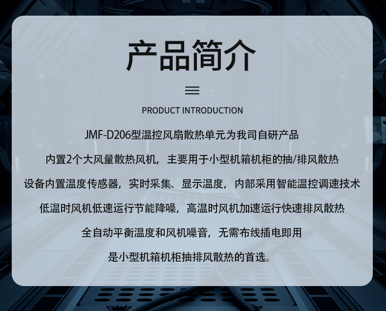 JMF-D206 型·機箱溫控風扇單元為我司原研產品,內置 2 個大風量直流散熱風機,設備主要用于小尺寸機箱機柜的抽/排風散熱。
