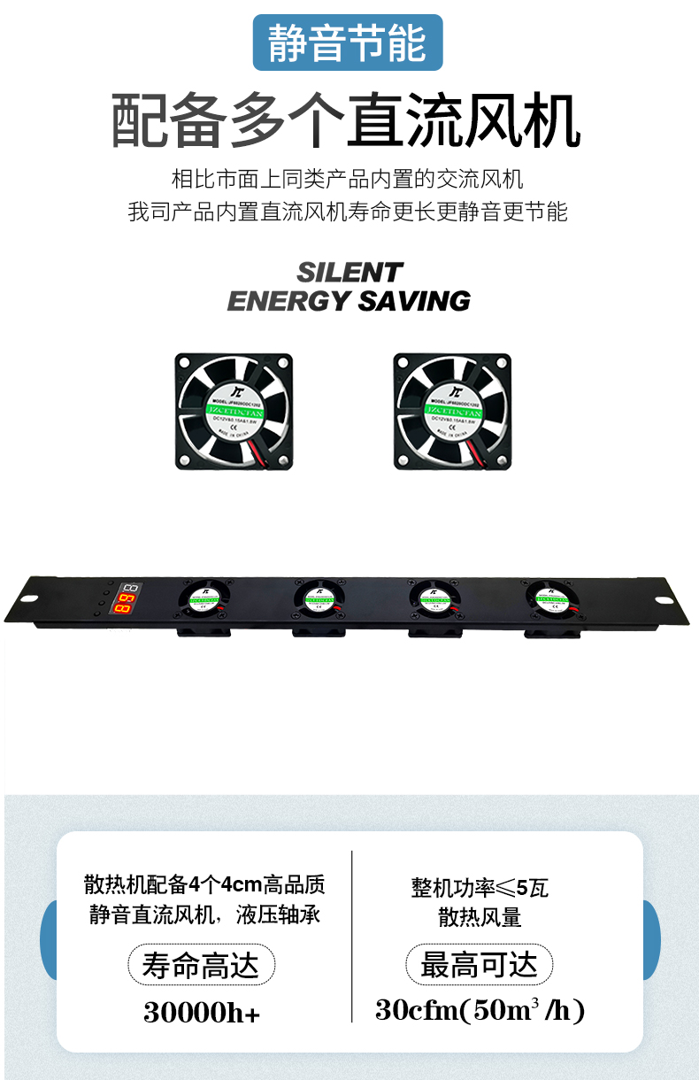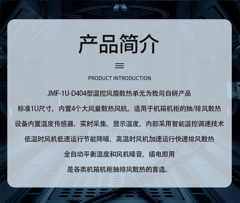 JMF-1U-D404型·機柜溫控風扇單元為我司原研產品,1U標準尺寸,內置4個大風量直流散熱風機,設備主要用于機箱機柜的抽/排風散熱