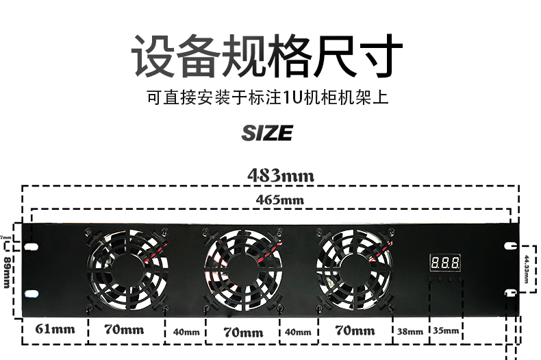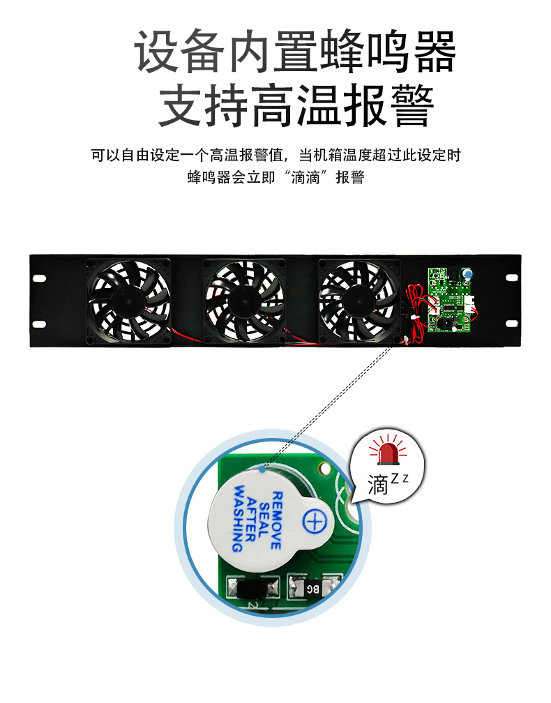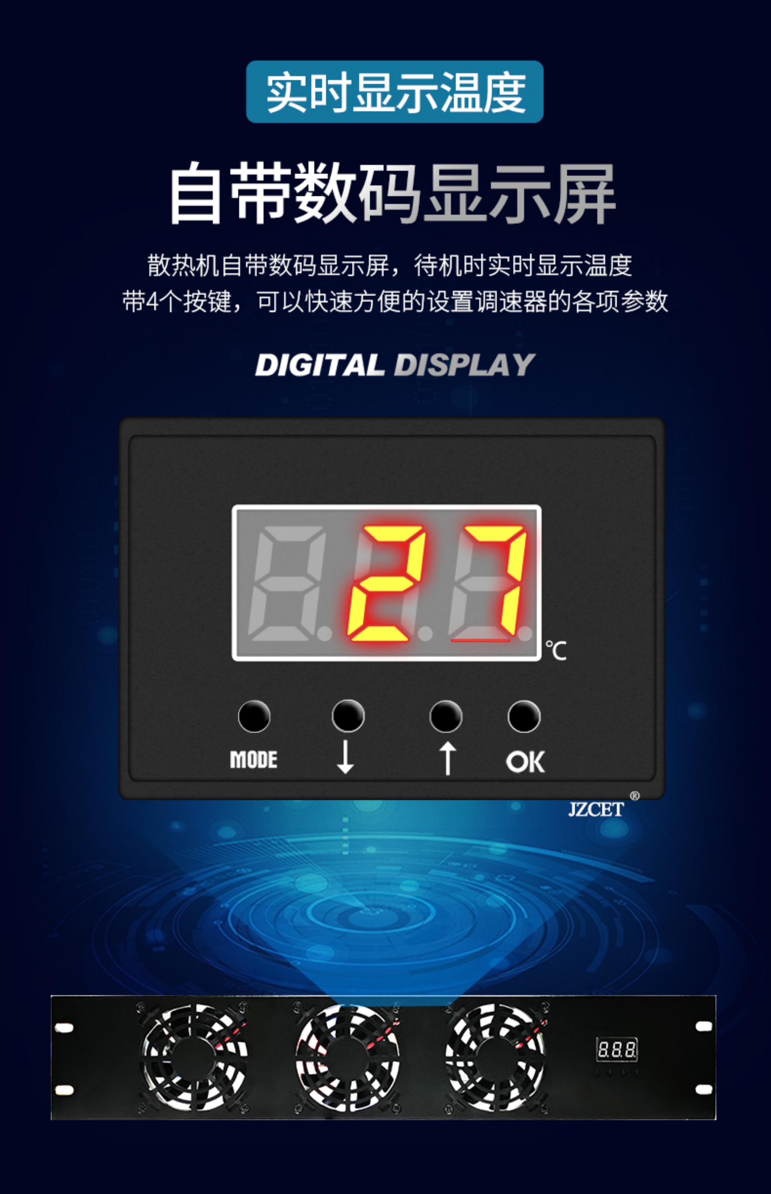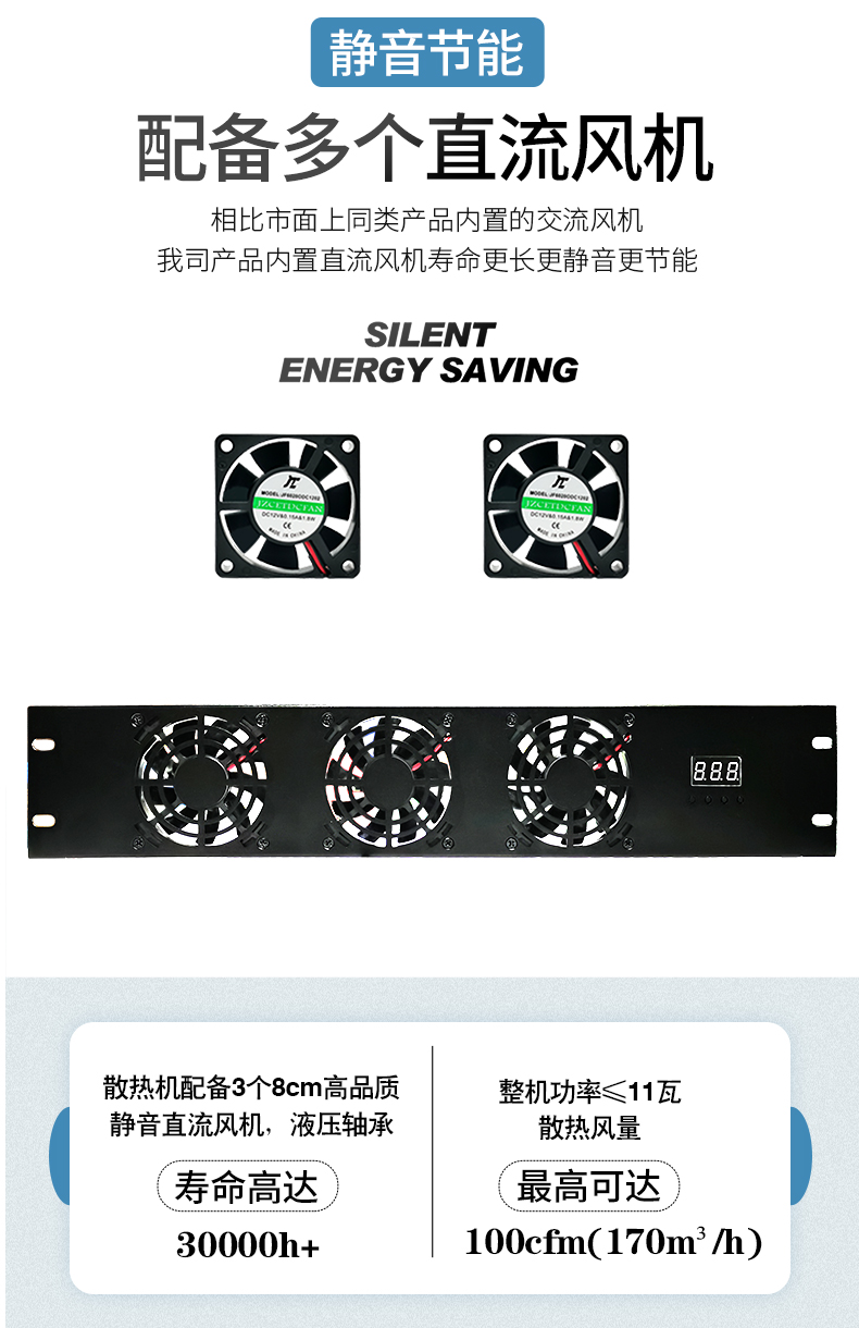 JMF-2U-D308型機柜溫控風扇單元為我司原研產品,2U標準尺寸,內置 3 個大風量直流散熱風機,內置蜂鳴器支持高溫報警,設備主要用于機箱機柜的抽/排風散熱。